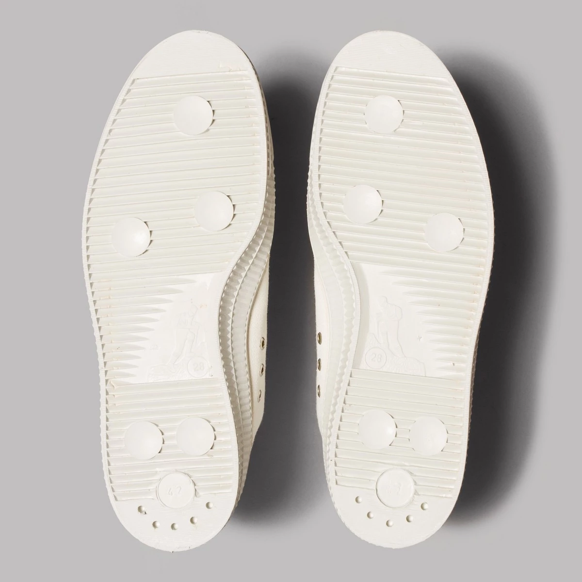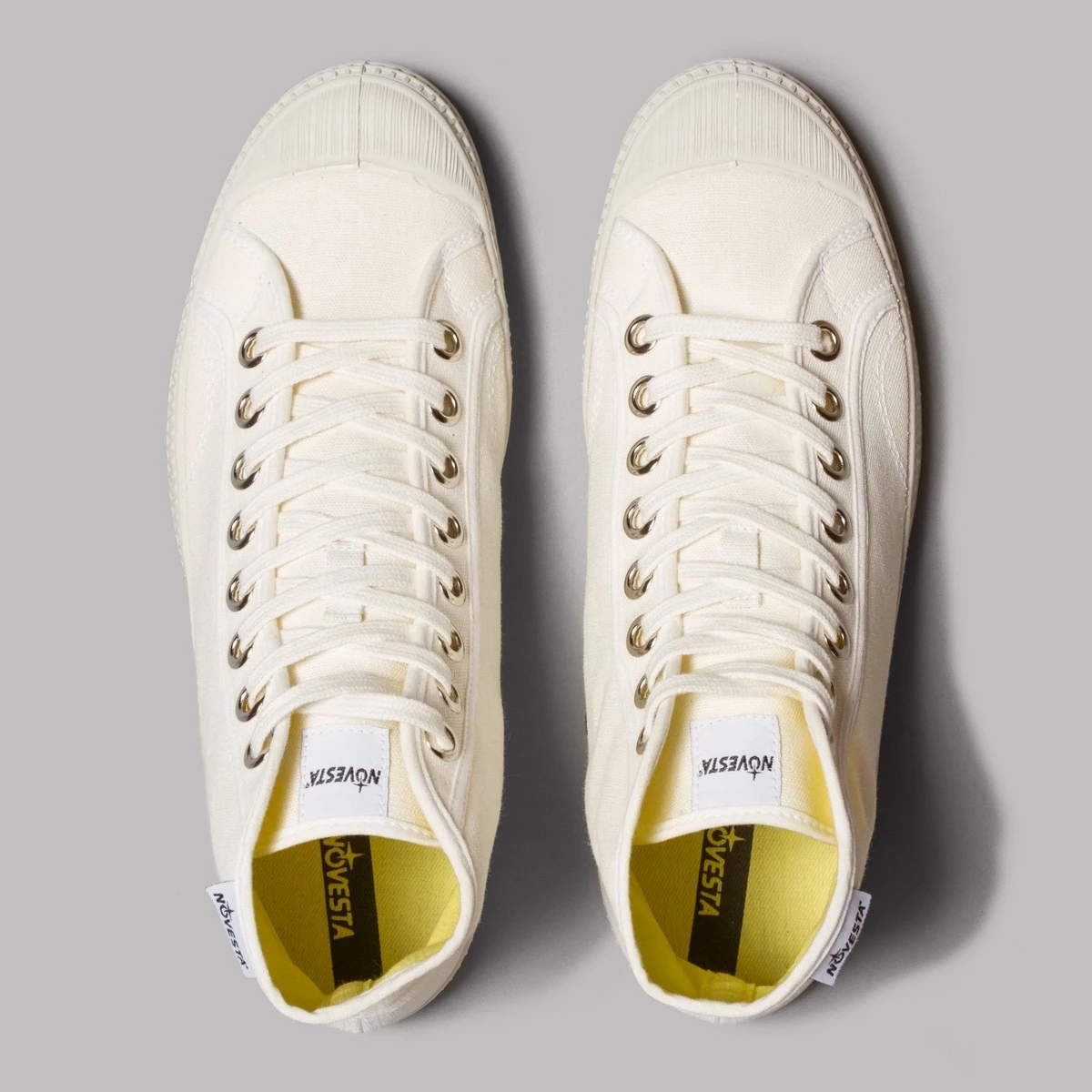 Cotton canvas upper. Vulcanised natural rubber sole. Chrome eyelets. These run a little big, consider sizing down. PETA-certified vegan. 41 = UK 7 and so on. The Star Dribble is a high top canvas pump from Novesta. Made in the same factory, and with the same equipment as they were back in 1939, these have a certain charm missing from most things these days. The toes are chunky, the eyelets are massive and there’s even a little sketch of an intrepid explorer on the sole… what’s not to like? Animal lovers should be pleased to hear that Novestas are now vegan too – not sure why you’d want to eat them, but we’re not ones to judge.