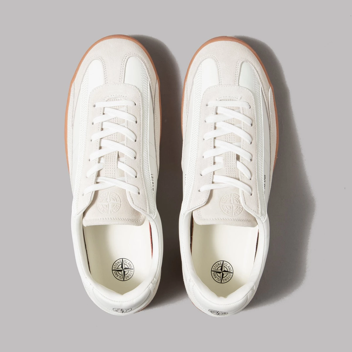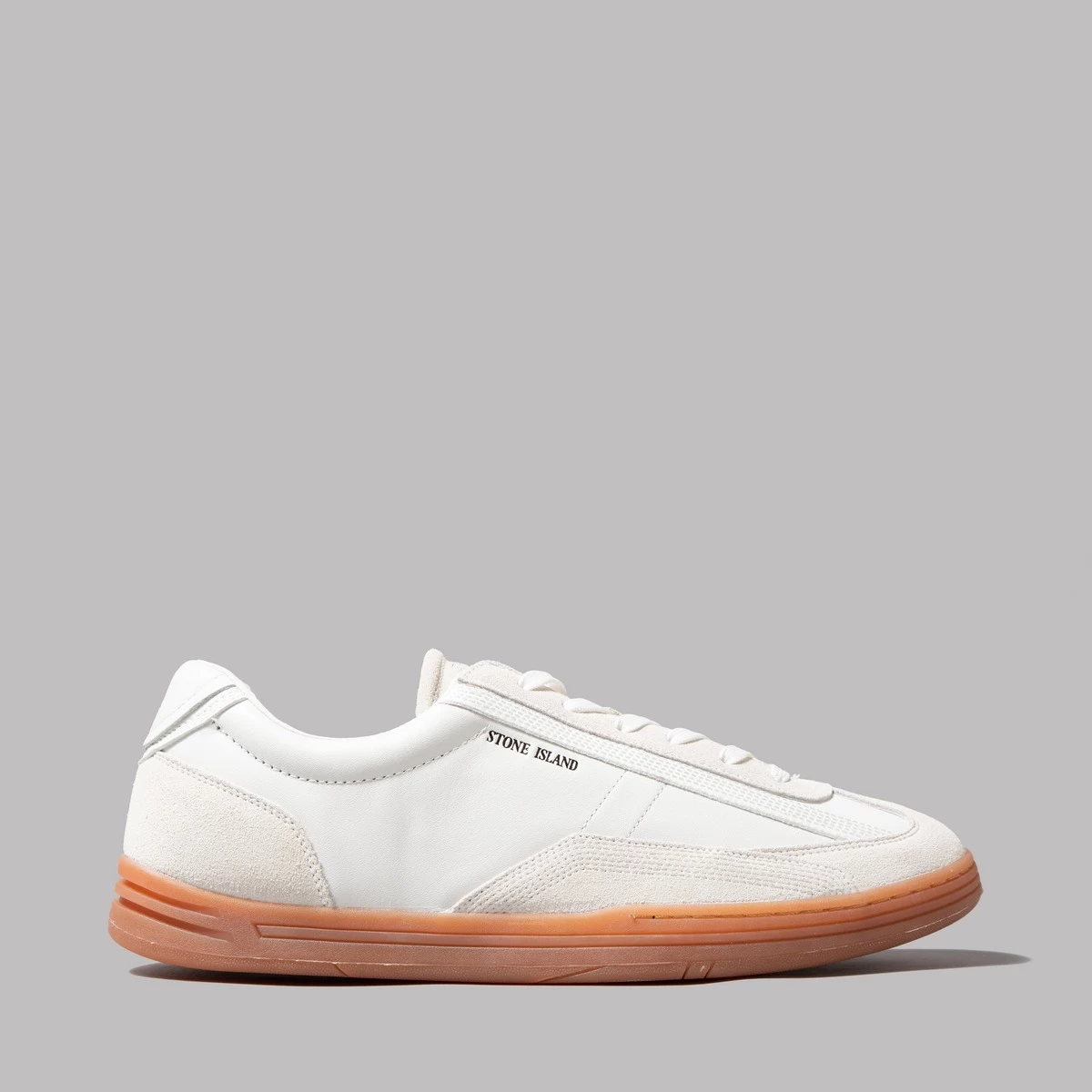 Leather/suede upper. Stone Island logo embossed on tongue and hell. Gum sole. True sizing. Here we have the 77FWS0101 trainers from Stone Islands slick and slightly-sci-fi-sounding Footwear Program. Clearly yanking design inspiration from the German army trainers of yore, these have been kitted out with stout gum soles and some incredibly plush leather that, despite the clear military influence, reeks of unbridled luxury.